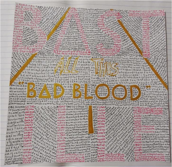 So, as this [past] week's project, I composed a sort of lyrics artwork. I'm no artist and the best I could come up with is combining the two albums' cover art. I overlapped the letter art of All This Bad Blood with the album art of Bad Blood and voilà, I had a sort of mini-poster. The catch is that everything is "painted" in letters - the lyrics of all 24 songs. It was quite the task, but I think it was worth it. (No doubt, I have a huge margin for improvement. But these activities were devised to make me make art!)
